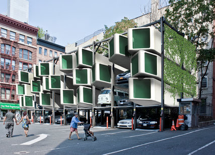 Another iteration of the parking space: The “upLIFT” (a project from designers Lawrence Zeroth, Jack Phillips, Brian Schulman and Eugene Lubomir), which proposes that small, pre-fab “housing pods” be mounted on vertical car-lift slots in increasingly less car-centric New York City.